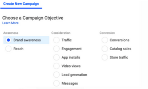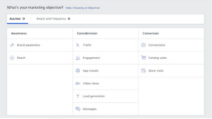Lorsqu’une agence de communication digitale ou une entreprise souhaite lancer une campagne payante publicitaire sur Facebook, la plateforme énumère plusieurs objectifs, à savoir, celui de la notoriété (Awareness), le trafic (Traffic), l’engagement (Engagement), les prospects (Leads), promotion app (App Promotion), conversion (Sales). D’autres objectifs sont également explicités à savoir, les vues de vidéos, les messages, les ventes catalogues.